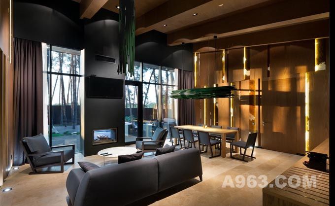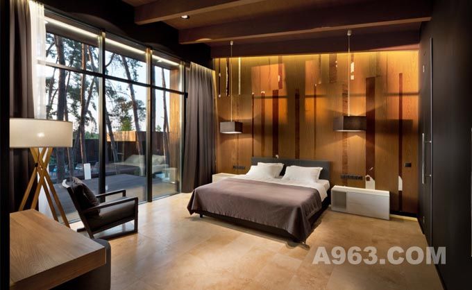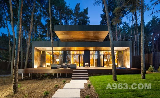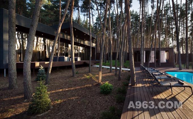 成都喜力设计 这个作品位于在乌克兰的一个综合休闲公园,整个小屋被一片松树林包围。公寓基础与通常的坚实基础不同,是建立于所谓的螺丝基础上的。这个结构可以将公寓巧妙地安置在松树林中,且不会损害树木本身或其根系。